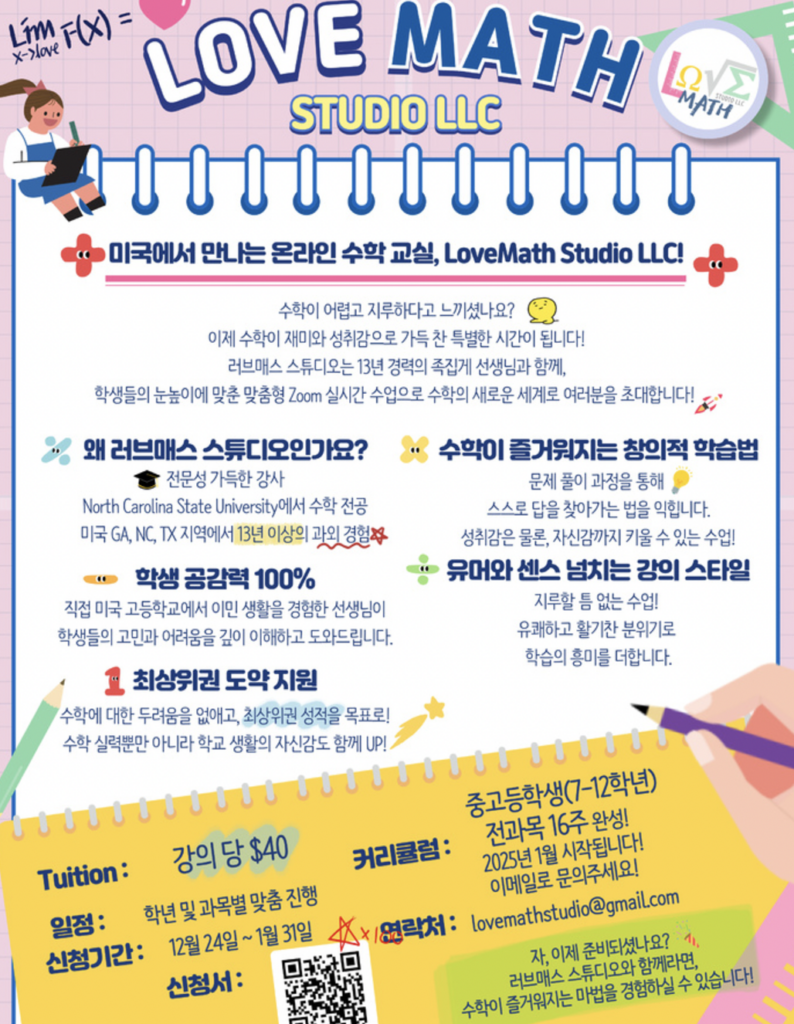 13년 경력 족집게 강사가 직접가르치는 온라인 수학 학원 LoveMath Studio LLC에 여러분을 초대합니다.