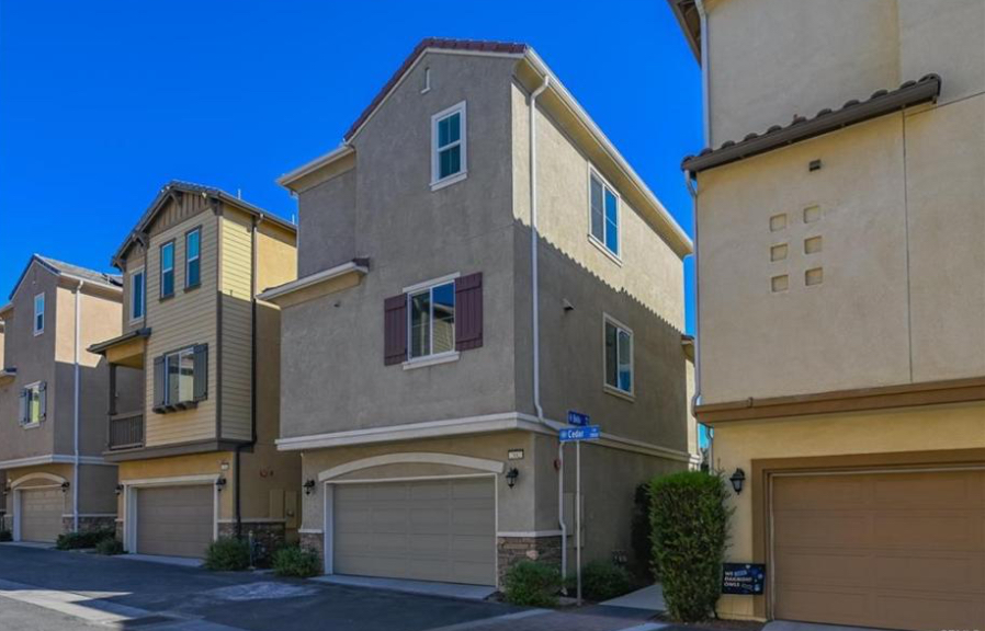 Welcome to your new sanctuary at The Grove in Pomona, a gated community featuring detached condominiums with no shared walls. This home starts with a versatile flex room on the first floor, ideal as a home office or additional living space, and a private, expansive yard. The attached two-car garage provides ample storage and secure parking. The second level boasts an open-concept living area and a modern kitchen with a large island, stone countertops, custom tile backsplash, and hardwood flooring. Natural light enhances the space, opening to a patio perfect for morning coffees or evening relaxation. The third level is a tranquil retreat with three spacious bedrooms, including a primary suite with an en-suite bathroom. Central AC, in-unit washer and dryer, and a tankless water heater offer comfort and convenience. Potential for a fourth bedroom or additional loft space provides flexibility. Located near Claremont Colleges and with easy freeway access, this community offers a BBQ area and a playground, ideal for family activities.